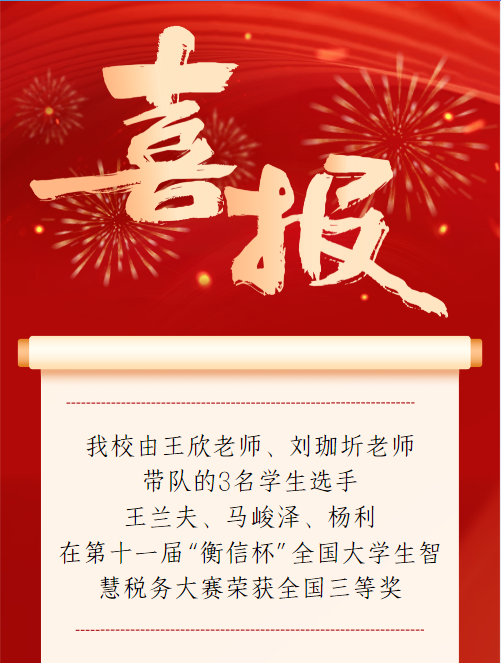 作为财税领域顶流赛事,本届“衡信杯”吸引全国2000余所院校20万学生参与,总决赛聚焦“金税四期”下税务风控、财税大数据等核心能力,设置真实企业实操场景。我校由王欣老师带队的3名学生选手(王兰夫、马峻泽、杨利),在100组本科晋级队伍中沉着应对复杂案例,完成增值税申报、税务数字账户应用等任务,最终斩获全国三等奖。